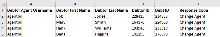 The file type Lariat accepts is CSV (comma separated value). The columns do not have to be in any specific order. The top row of the CSV file contains the column headings, and these are used to map the data to the individual Lariat fields. For each response code Lariat will only allow one Debtor record. Multiple response codes for one debtor requires multiple records in the CSV file.